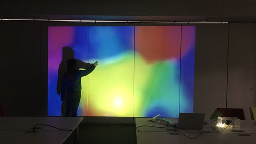 その時の気分に合わせて、部屋やその他の場所の色の環境を作るという作品です。気分に合う色のカラータイルを選んで透明の台の上に置くとその色を元に水彩画のようなグラフィックが生成され、それを壁などに投影して楽しみます。色彩に連動した音も自動で流れるので、部屋や店舗の雰囲気作りに使えそうだと考えています。